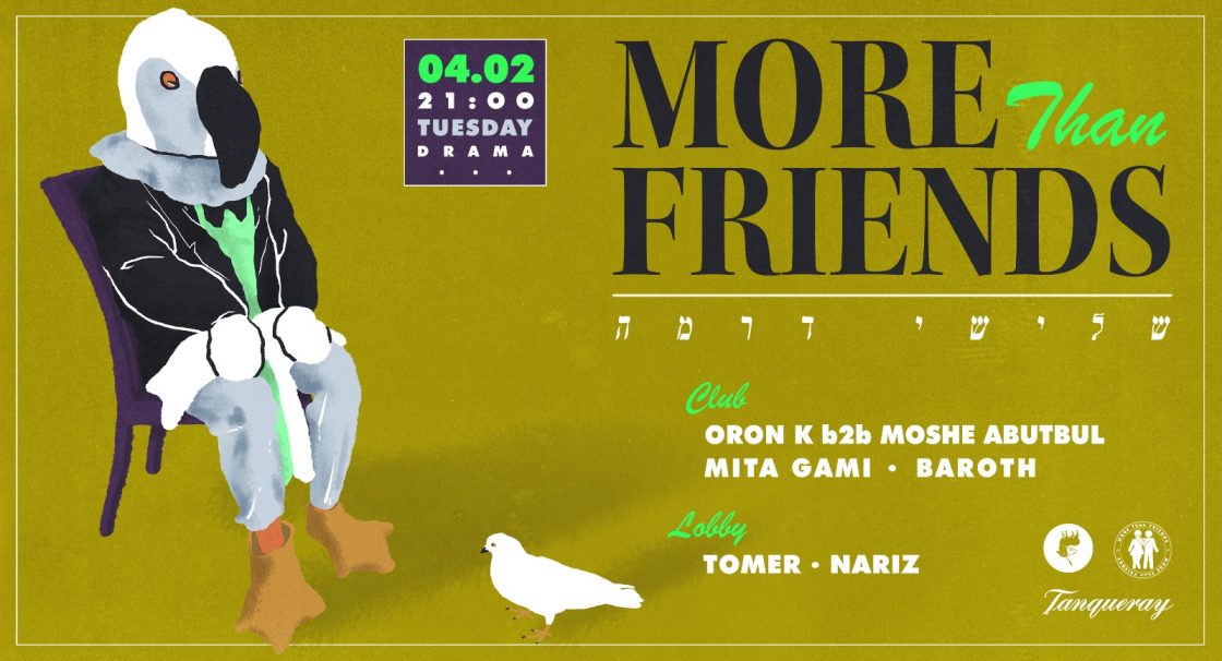 ביום שלישי ה4.2 מסיבה אלקטרונית בדרמה עם הליין More then friends תיקלוטים עד הבוקר עם ווייב אוהב במיוחד.